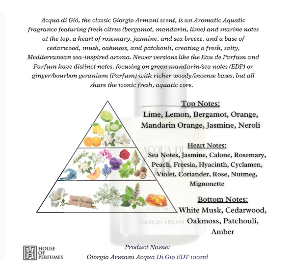 Acqua di Giò, the classic Giorgio Armani scent, is an Aromatic Aquatic fragrance featuring fresh citrus (bergamot, mandarin, lime) and marine notes at the top, a heart of rosemary, jasmine, and sea breeze, and a base of cedarwood, musk, oakmoss, and patchouli, creating a fresh, salty, Mediterranean sea-inspired aroma. Newer versions like the Eau de Parfum and Parfum have distinct notes, focusing on green mandarin/sea notes (EDP) or ginger/bourbon geranium (Parfum) with richer woody/incense bases, but all share the iconic fresh, aquatic core.