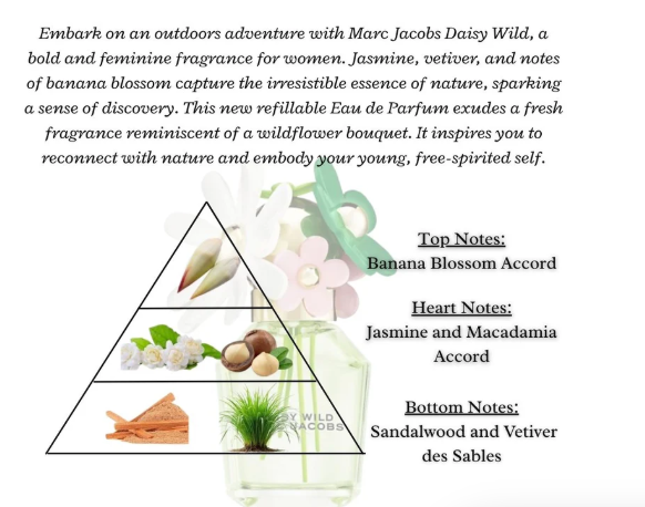 Embark on an outdoors adventure with Marc Jacobs Daisy Wild, a bold and feminine fragrance for women. Jasmine, vetiver, and notes of banana blossom capture the irresistible essence of nature, sparking a sense of discovery. This new refillable Eau de Parfum exudes a fresh fragrance reminiscent of a wildflower bouquet. It inspires you to reconnect with nature and embody your young, free-spirited self.