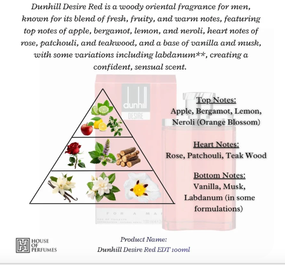 Dunhill Desire Red is a woody oriental fragrance for men, known for its blend of fresh, fruity, and warm notes, featuring top notes of apple, bergamot, lemon, and neroli, heart notes of rose, patchouli, and teakwood, and a base of vanilla and musk, with some variations including labdanum**, creating a confident, sensual scent.