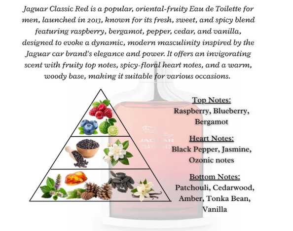 Jaguar Classic Red is a popular, oriental-fruity Eau de Toilette for men, launched in 2013, known for its fresh, sweet, and spicy blend featuring raspberry, bergamot, pepper, cedar, and vanilla, designed to evoke a dynamic, modern masculinity inspired by the Jaguar car brand's elegance and power. It offers an invigorating scent with fruity top notes, spicy-floral heart notes, and a warm, woody base, making it suitable for various occasions.